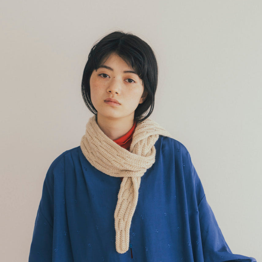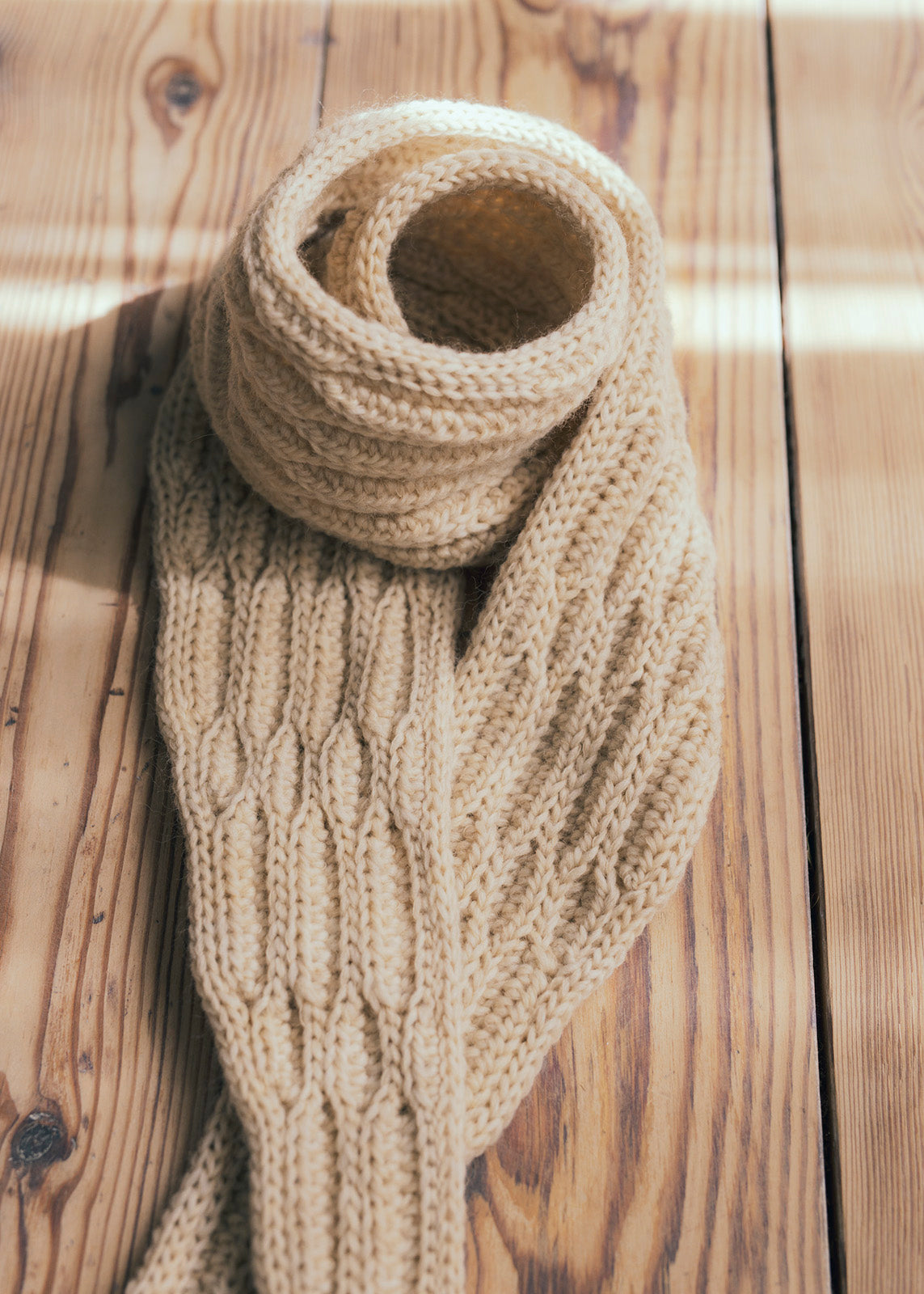 Designed by Anne-Michelle Phelan, Bayle is a thin scarf that can be quickly wrapped around the neck when it is cold and is an excellent accent for any outfit. It was inspired by the beautiful texture of fishing nets and practical accessories that are essential to life by the sea.