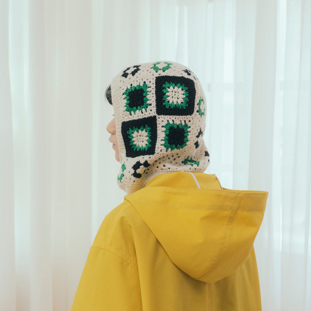 This hood is crocheted in two styles of squares, which are then seamed together. Stitches are picked up around the face opening and around the neck opening, and knitted ribbing is worked in the round. Puff Stitch and Granny Squares are worked in rounds with RS facing.