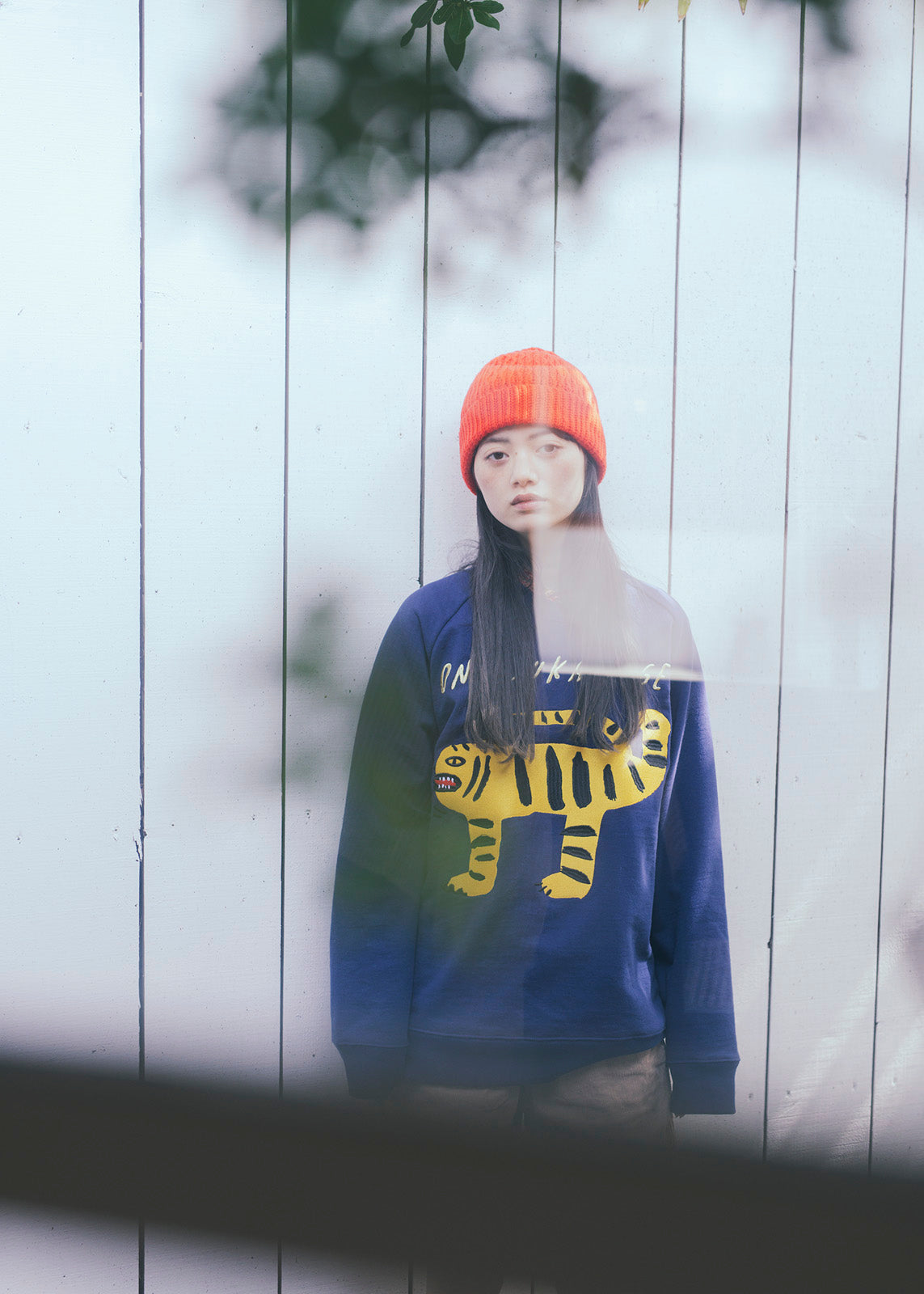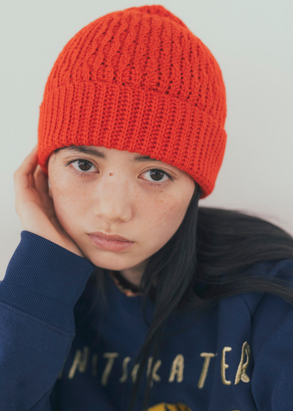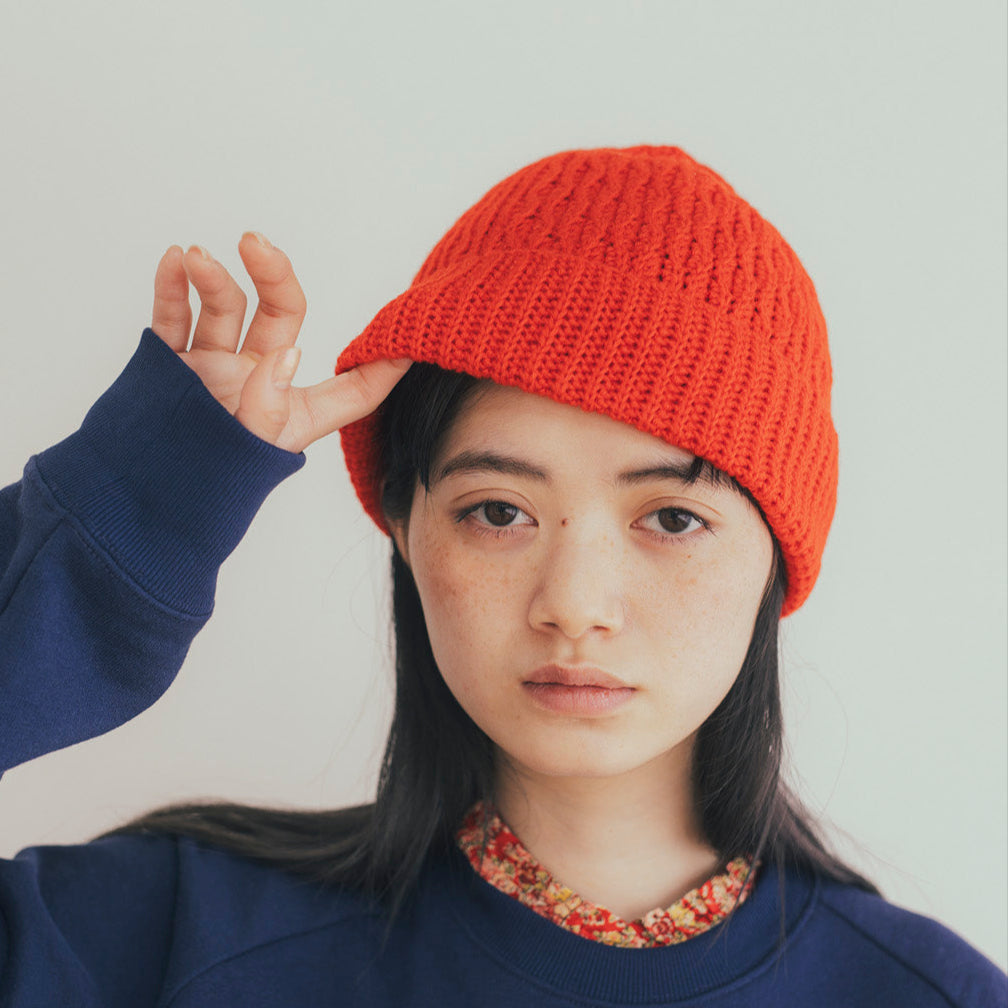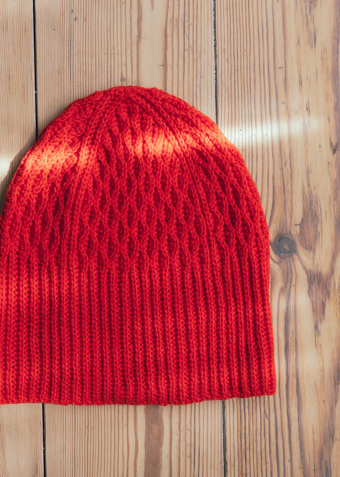 A beanie with a wavy rib pattern. This rib pattern was inspired by the texture of fishing nets used in the Irish port town, where the designer grew up.