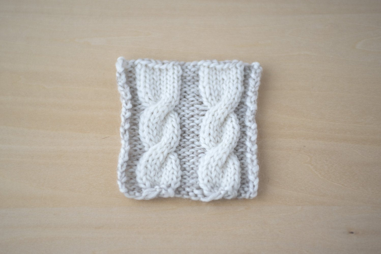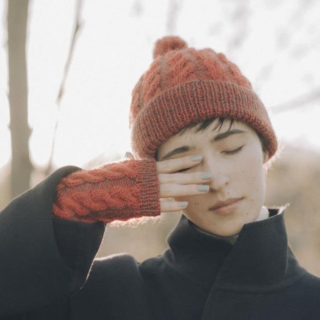 These fingerless mitts are knit in the round from the bottom up. The cable pattern is worked with two yarns: a single stand of Genmou is used when knitting the cables and then held together with a single strand of Silk Mohair when working the reverse stockinette stitch in between. The thumb gusset is placed on hold until the body is completed and then is worked in the round.